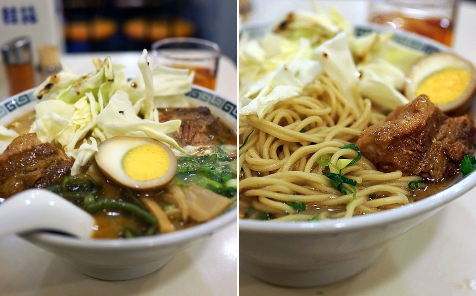 生のキャベツがシャクシャク食感たのしくて、しかも甘くてひと噛みごとにコッテリスープを拭い取る…、次の一口おいしくさせる。