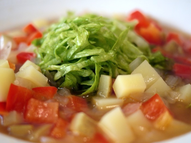 お皿にこんもり盛りつけてそこにタップリ、スープを注いで、まるでホットサラダのよう。