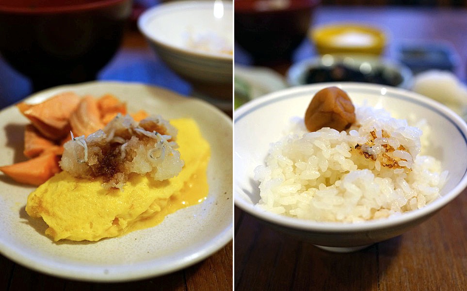 チーズを挟んで作ってもらって、そこにしらすおろしに醤油をチュチュっ…、分厚い鮭の切り身を焼いたものをほぐして一緒に食べるとサーモンオムレツが口の中で出来上がる。