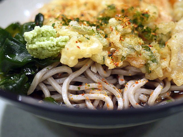 天ぷら蕎麦にのっかるかき揚げが衣がフックラしていて、タレをズブズブたっぷり吸い込む。