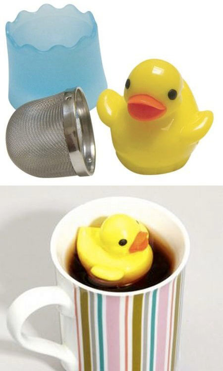 プラスティックでできたあひるさんに、茶葉を入れた金属製のバスケットつけ、カップに浮かべてお茶を出す。