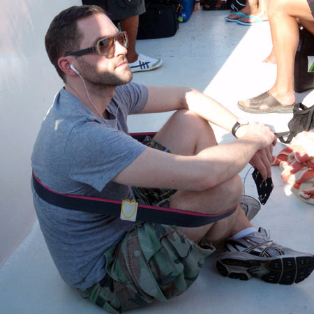 幅広の、シートベルトのベルトのようなベルトで足をお腹に引きつけるように、背中にグルッと回して留める、たったそれだけ。