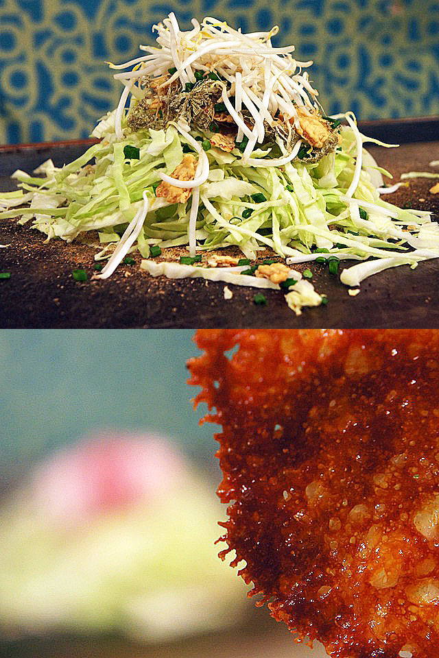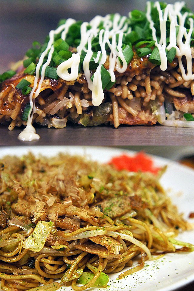 焼くとバッサリ、乾いた感じに仕上る麺をよくやき、ソースを含ませ丸く形を作ってお好み焼きのキャベツと生地をそっとのっける。
