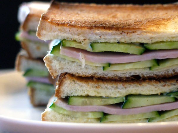 その上にまた薄切りキュウリをのっけて、胡椒と塩をほどこしてパンで蓋する。