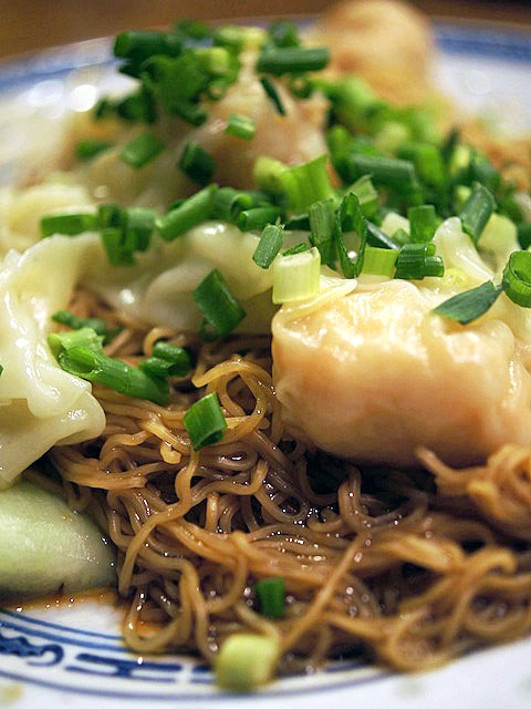 茹でた極細の香港麺を湯切りし、それにタレをからめてつくる。