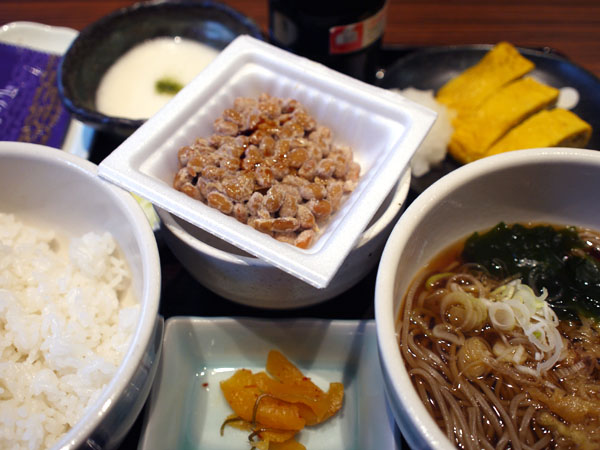 蕎麦にご飯のっほぼ全部のっけの朝定食で、テーブルの上をにぎやかにする。
