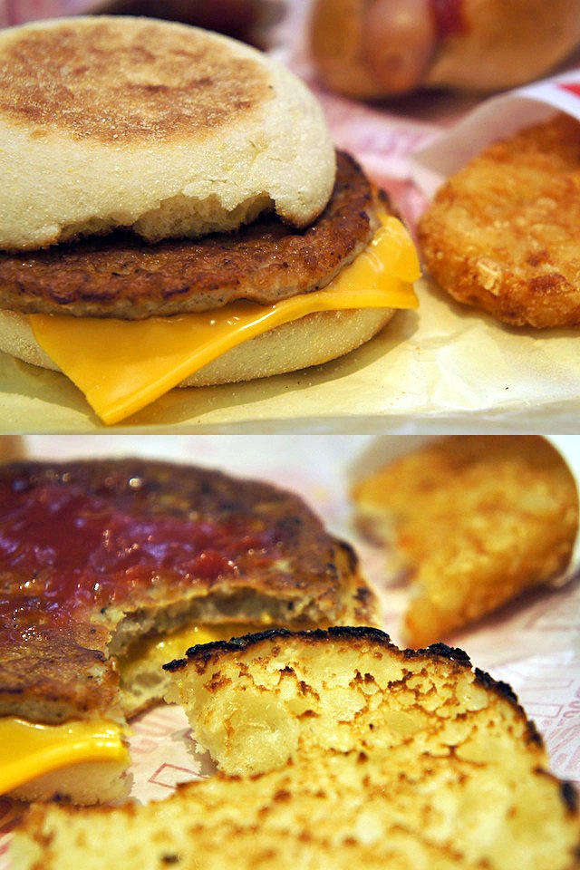 ただでもらったケチャップを、ハッシュブラウンを刷毛にしながらパテに塗り、プチュンと食べます。