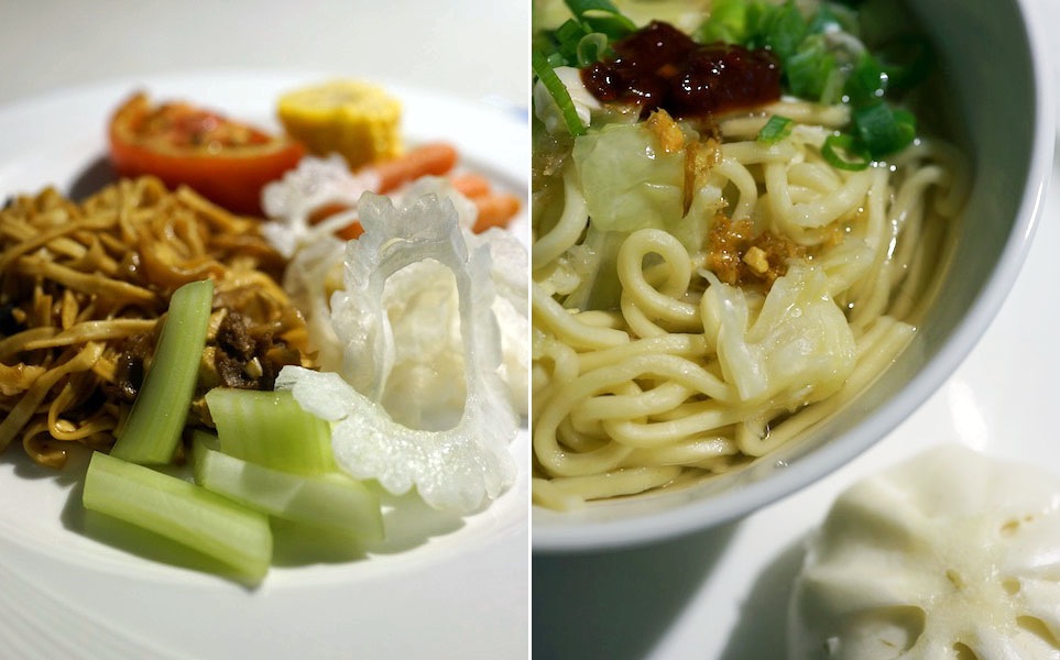 白いニガウリがシャキシャキ歯ざわり軽快で、みずみずしい上、やさしい苦味が口に広がり、伊府麺の油をスキッと拭い取る。