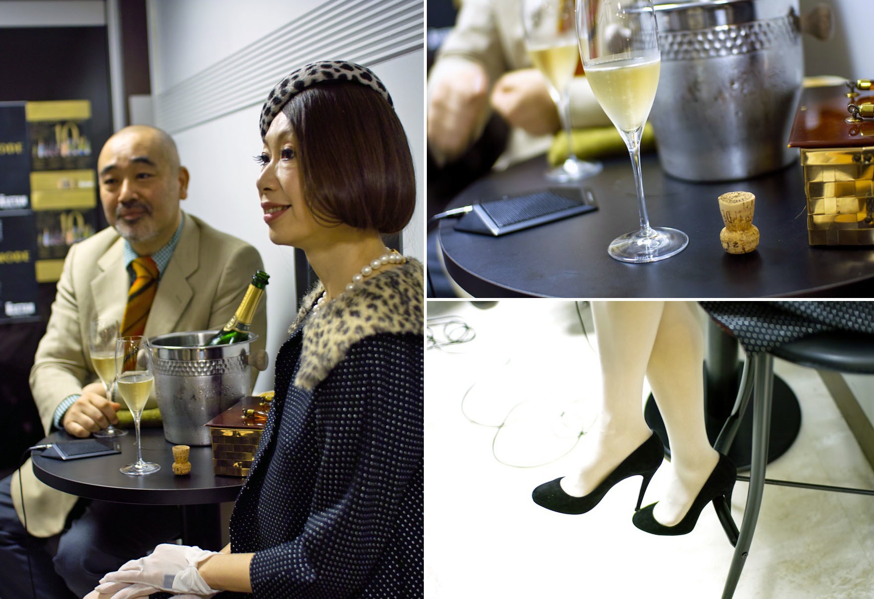 先回書かなかったですが、サカキさんのお洋服も素敵ですね。グリーンオングリーンに赤茶のタイ?野宮さんの、ヒョウ柄の襟とお帽子も小粋で(フワフワして暖っかそう)お二人ご一緒で、冷たいシャンパーニュの泡とコントラストがぴったり!ですね。
