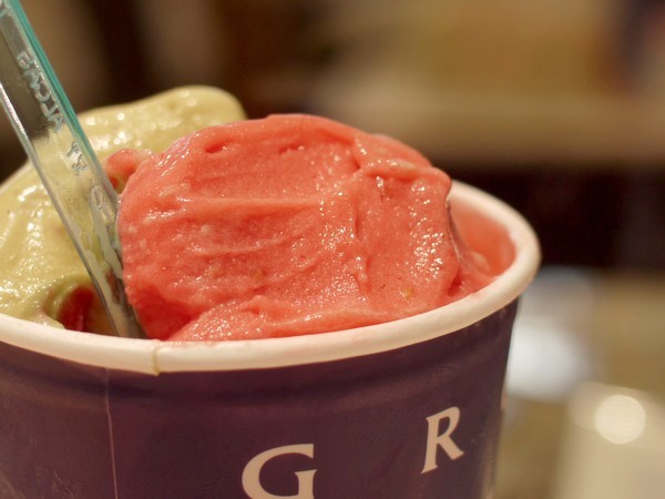 木苺のソルベと、ピスタチオのジェラートの盛り合わせ。