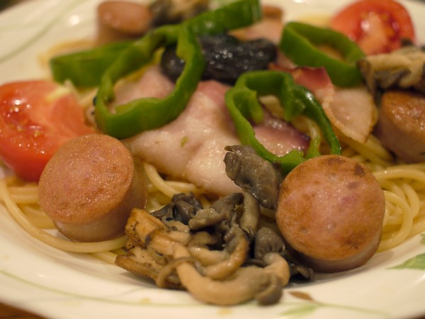 昔ながらの太いパスタに、ピーマン、トマト、シメジにしいたけ。