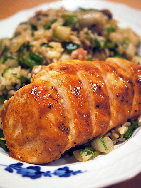 エキゾチックな香りがドッシリ、鶏の一枚肉に付きそれを食べやすいよう切り分けて、炒めご飯の上にのっける。