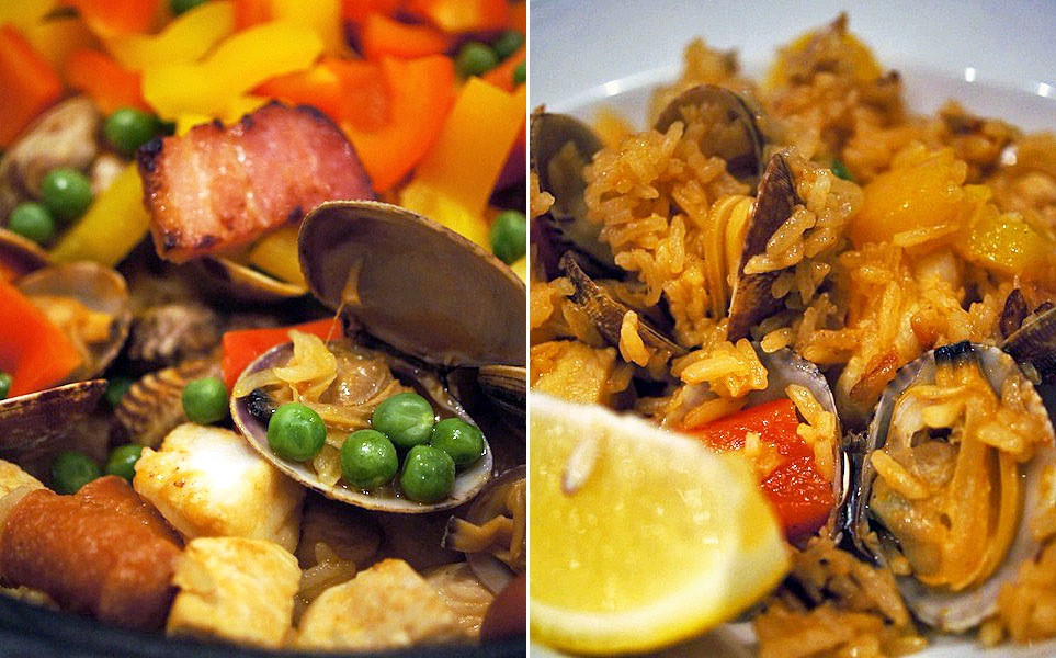 大きなアサリ、チョリソにベーコン、タラに鶏肉…、野菜は玉ねぎ、パプリカ、それからグリーンピースのさやを外して実だけを使う。