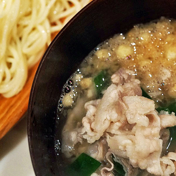 お椀にタップリ鰹節、それから天カスを入れたところにそれをザザッと注ぎ込み、冷麦つけてズルンとたぐる…、豚しゃぶを食べたあとの〆のような油と脂のうま味がおいしい。
