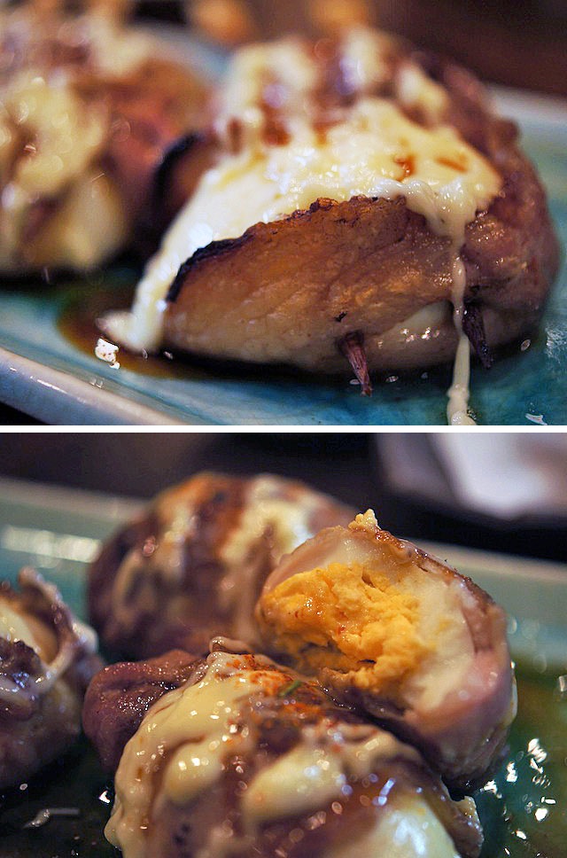 豚バラ肉で卵をくるんで焼いたモノ。