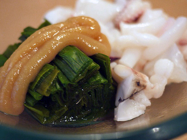 イカのゲソを塩ゆでし、ブツに切ったのをその横へ。