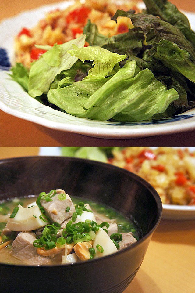 一緒にサラダを盛り込んで、今のテーマの「野菜を一杯食べましょう」プロジェクト的メインとします。