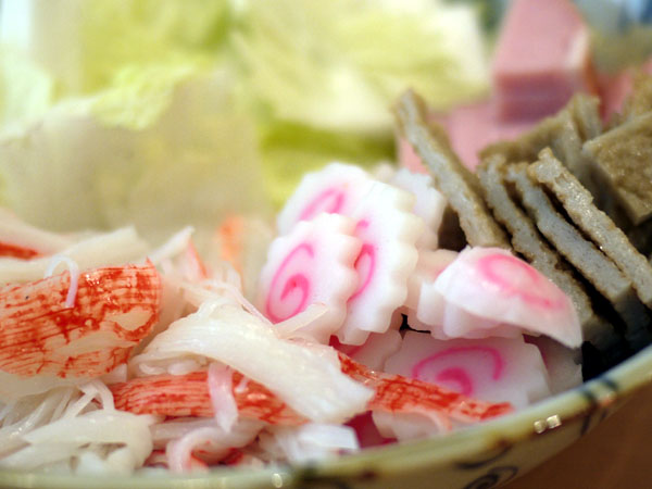 蟹カマボコにナルトにそれから、昨日みつけた長崎の「魚煎餅」っていう薄ぅく揚げたジャコ天みたいなアゴの練り物。