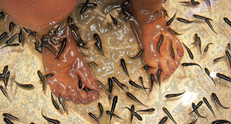 コイ科の小さな魚が入った水槽に、足をトプンと浸すとそこに群がって、古くなった角質を食べてくれるというモノで、前から試してみたかった。