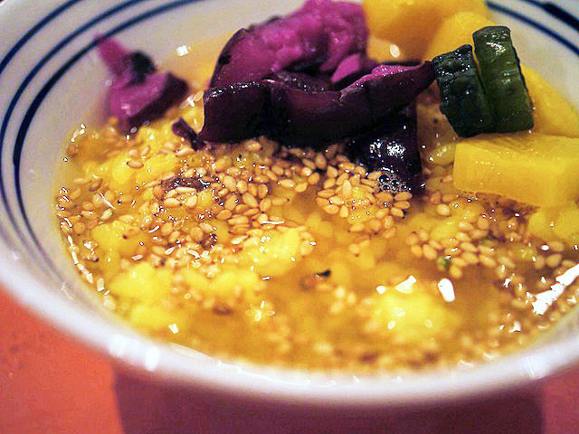 しば漬け、それからタクワンをのせ昆布の佃煮で風味をつける。