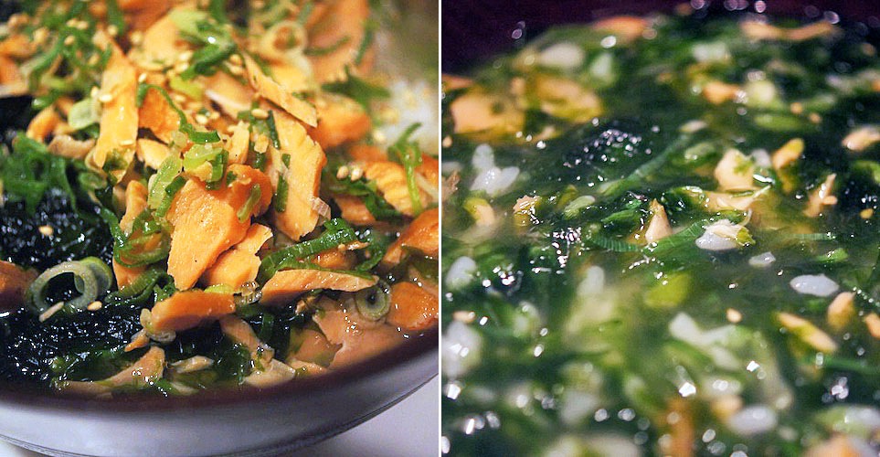 鮭の味わい、プチプチ弾ける胡麻の食感、そこにネギがシャクシャク軽快な歯ごたえくれる…、お椀の中を丁寧にかきまぜていくと海苔がトロミを手に入れてあたかも雑炊のようにふるまいごちそう感を高めてくれる。