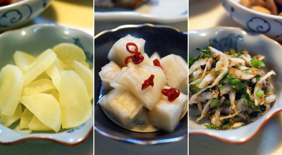 蕪が好きなボクのために、芯の部分は包丁いれて酢漬けにし、皮の部分は細切りにして葉っぱと一緒に塩漬けにしたの。