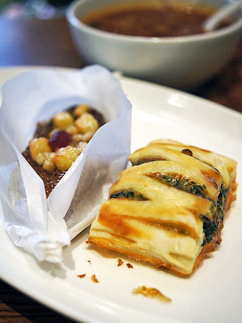 手前のパンがほうれん草のパイで、二つ折りにしたお札くらいの面積しか無い。