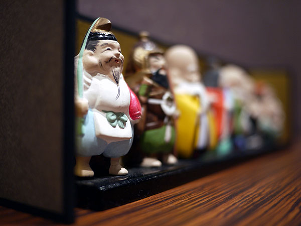 弁天様を含む七福神がずらりと揃った人形で、どこの店にも置いてある。