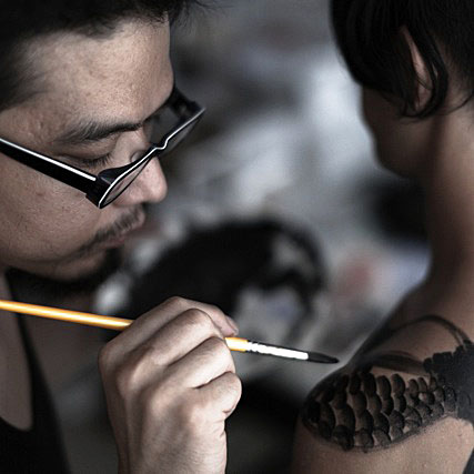 たのまれれば友人の店のオープニングのイベントとして、障子や襖に描いたり、ボディーペイントに挑戦したり。