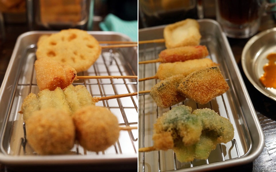 串かつって食べ物って、串焼きに比べて使える具材の種類が豊富で多彩…、野菜に肉に魚とあれこれ、だから食べてて商いのがよい。