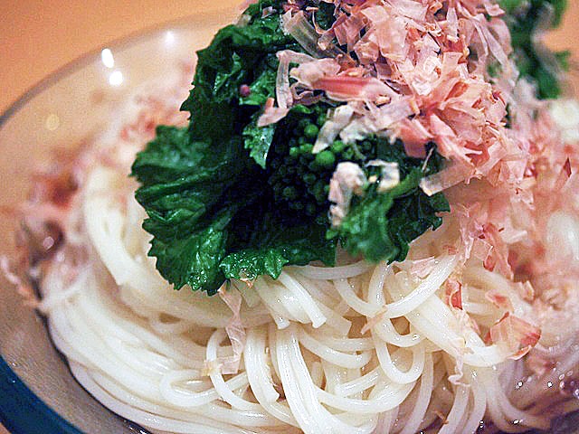 そこにそうめん、それから菜の花をゆでたののせて、鰹節をちらしてズルンとたぐる。