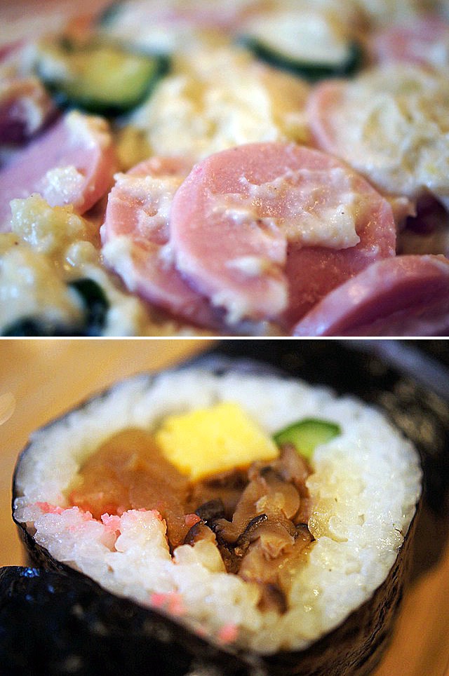 キュウリに炊いたシイタケに、焼いて刻んだ穴子にかんぴょう…、どれも甘くてみずみずしくて、そこにさくら色したデンブが彩りそえてうつくしい。