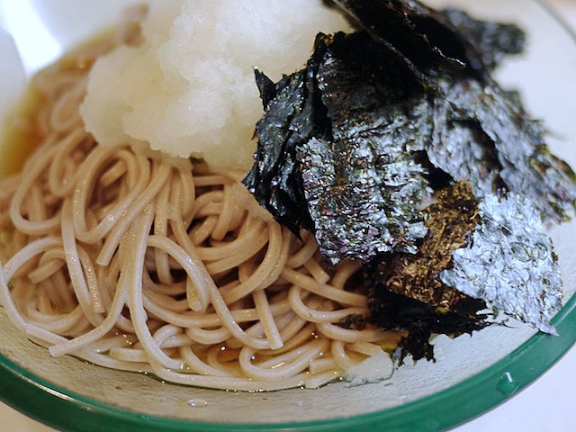 醤油をちょっとたらして麺つゆの甘みをやわらげ、スキッと風味をくわえたところに、茹で上げそばを冷たく〆てうずたかくもる。
