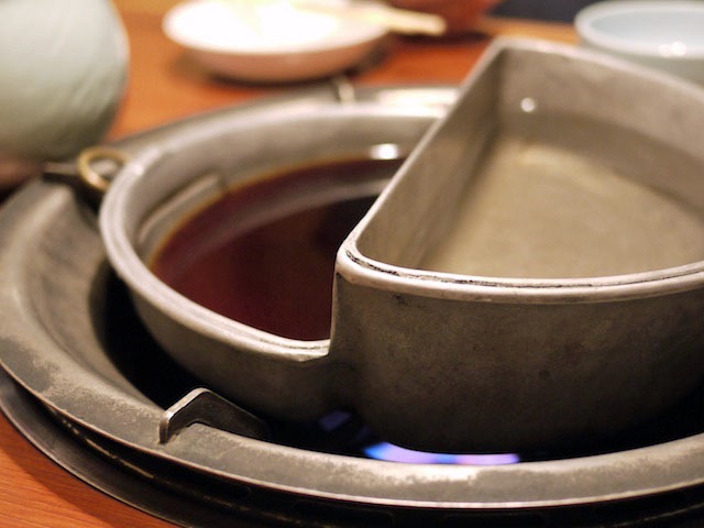 すき焼き鍋としゃぶしゃぶ鍋を真っ二つにして溶接しました…、って感じの姿にかなり勝手に盛り上がる。