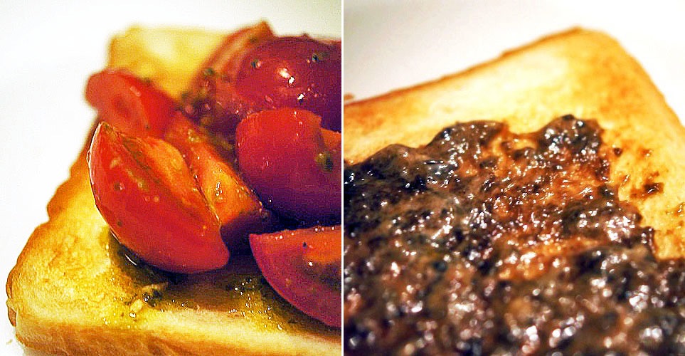 ジェノバソースでアクセントをつけたトマトのオリーブオイル漬けを乗っけて食べると、プチュンととてもみずみずしくてイタリア料理を食べてる感じ。