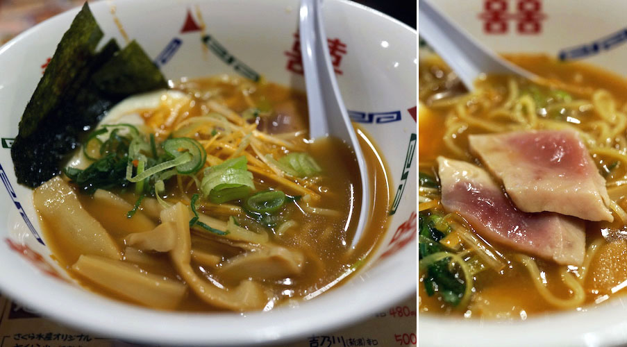 見れば看板に富士山、桜、浮世絵風の人物像と、こりゃちゃっかり外人客もターゲットにする魂胆だなぁ…、って。