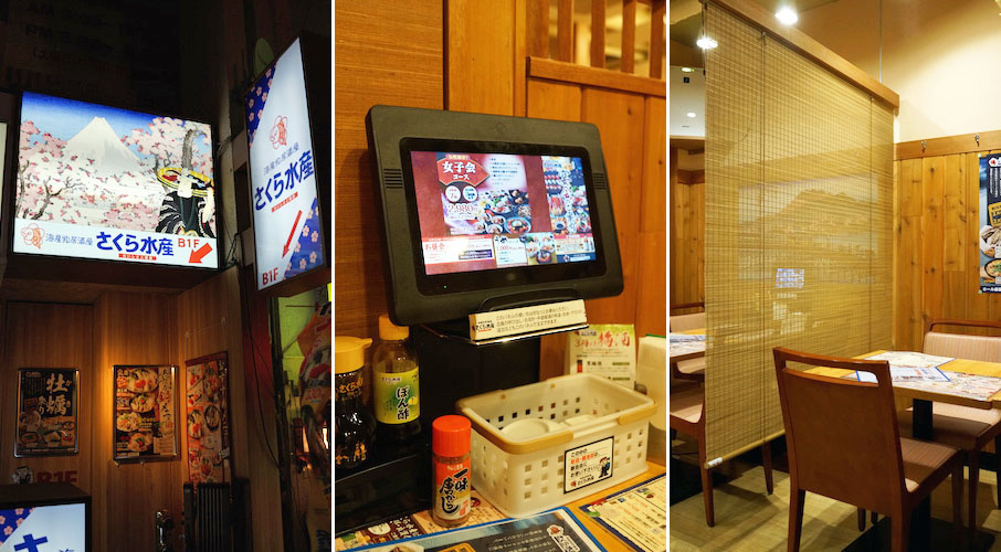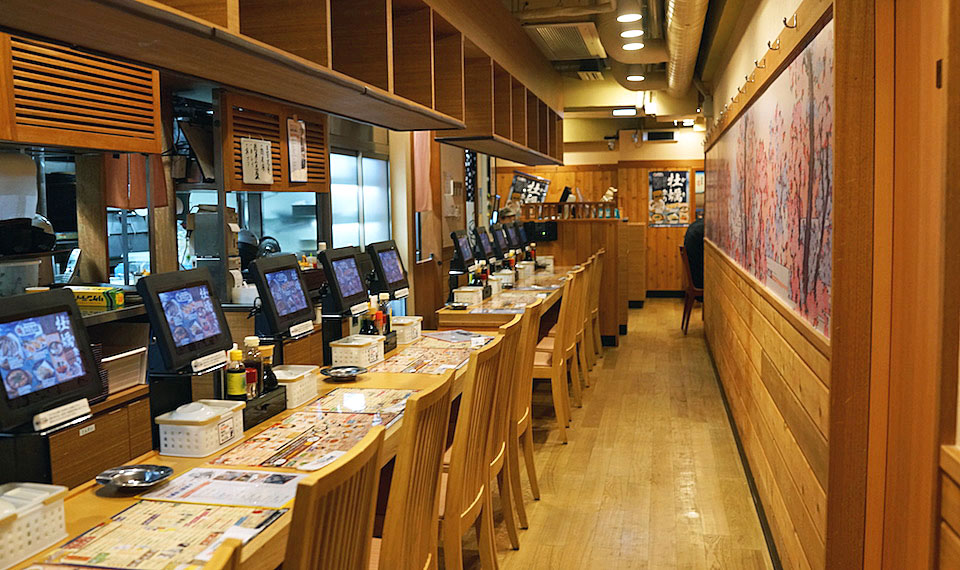 椅子一脚に対して1個ずつ、タブレットが並んでいる様。なんだか未来のレストランのようでビックリ。こういう景色を外国人が見たら喜ぶんじゃないかと思う。笑っちゃう。