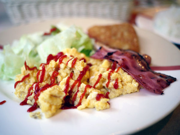 スクランブルエッグにはケチャップかけて、まさに見事な和洋折衷。