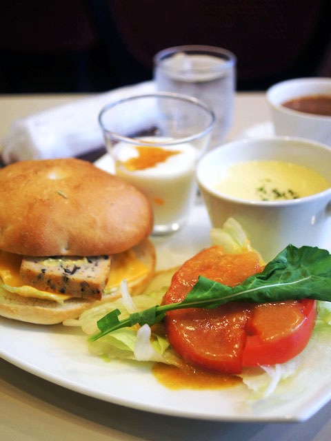 ハンバーガー状のサンドイッチにヨーグルトと言うかなり気合いの入った一品。