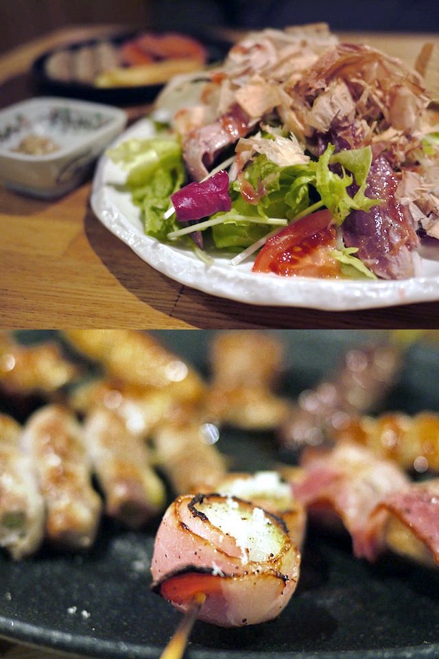カツオのハラミを大きくそぎ切り、表面を焼いたタタキ風にしたものをサラダの具とする。