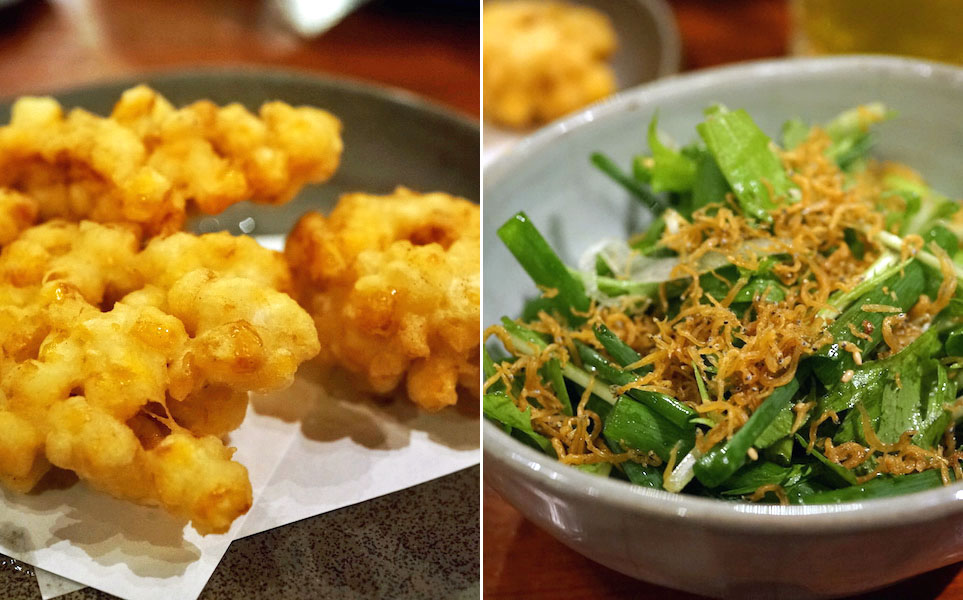 とうもろこしのかき揚げは、ふっくらとした衣に包まれプチプチ爆ぜるコーンの食感たのしくて、コーンの甘みと衣の塩味で、なにもつけずにそのまま旨い。