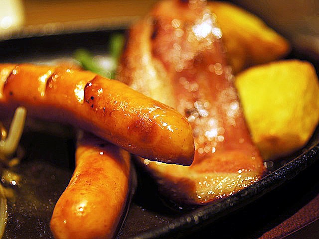 それにソーセージとベーコングリルが付いたミックスグリルみたいな感じの料理。