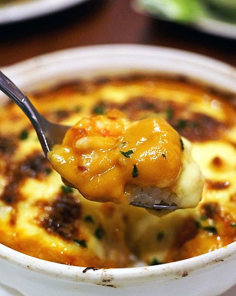 バターライスにアメリケーヌソースをタップリ、ホワイトソースにチーズにエビとホタテをタップリ…、こんがり焼けた焦げ目も見事でソースのポッテリ濃厚なのにノックアウトされてしまいます。