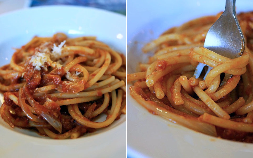上手に茹でられた上等の穴あきパスタのブカティーニのムチムチ感と、歯ごたえは見事なモノで、ソースのからみもなかなかに良い。