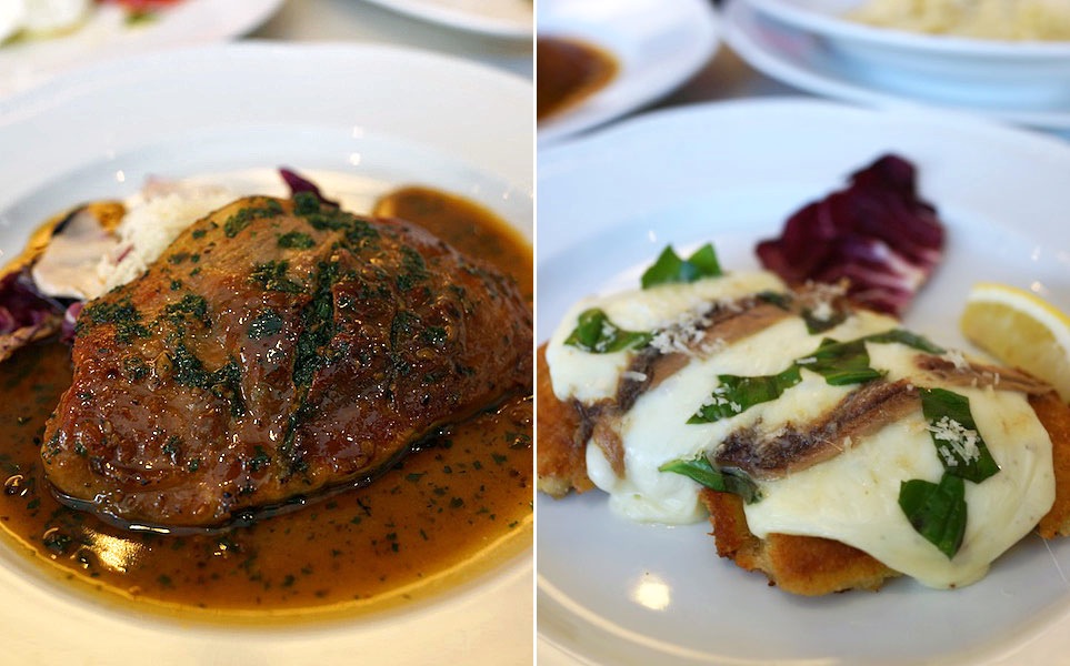 セージの香りが本物感を駆り立てるサルティンボッカ、フックラとした衣の食感やさしいカツレツ…、どちらも肉の歯ごたえ頑丈、たくましい。