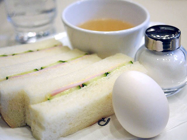 ハムとキュウリのサンドイッチに、スープにそれから茹で卵。
