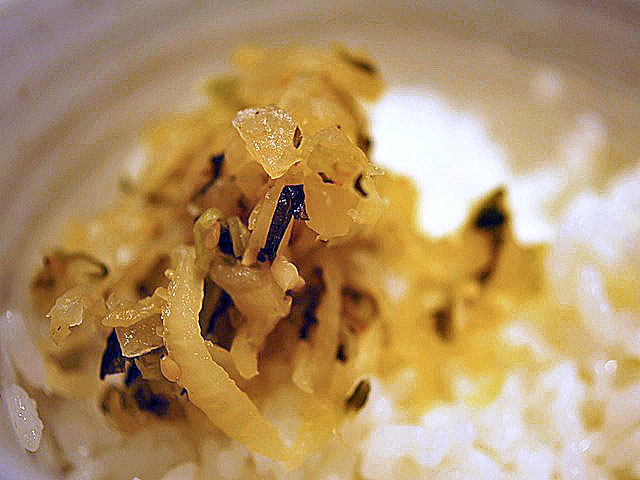 一膳目の量も控えめというのがちょっとウレシクて、テーブルの上に置かれた千切りタクワンも、パリパリおいしい。
