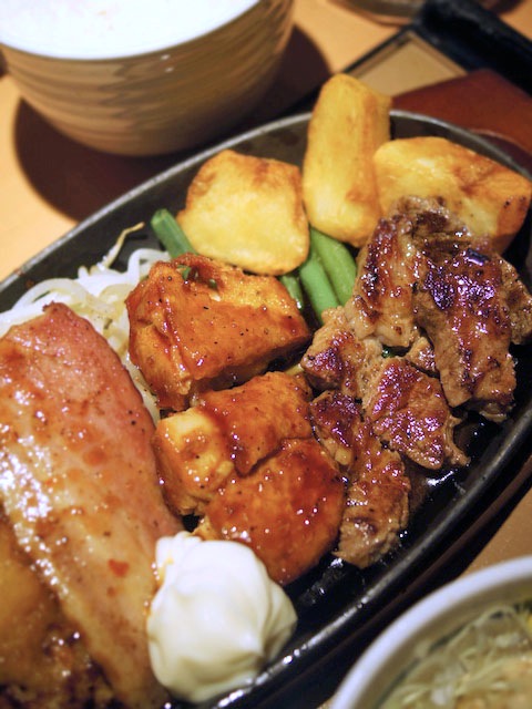 高いか、安いか今のファミレス事情をみるとかなり微妙で、小さなステーキ、鶏の照り焼き、ベーコン、それから和風ハンバーグ…、サイドの野菜もフライドポテトにモヤシ、インゲンと盛りだくさんでお値打ち価格であるに違いない。