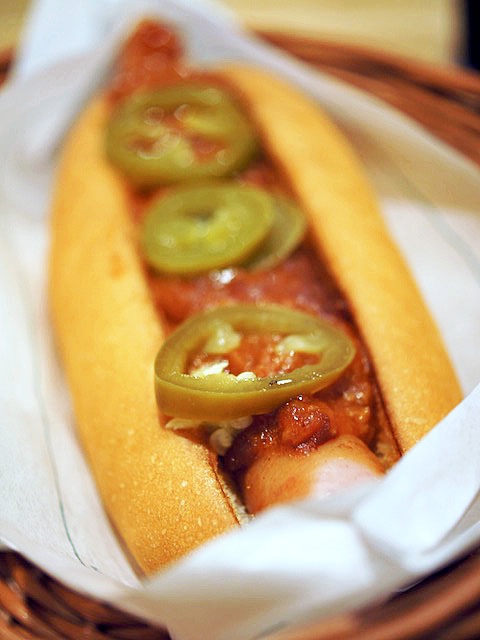 スパイシーチリドッグをたのんで食べる。