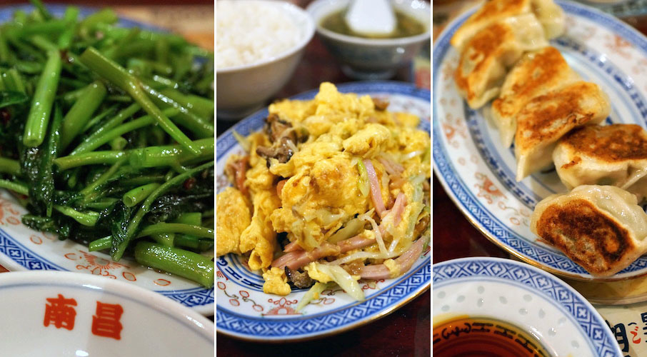 空芯菜の炒め物、餃子をたのんで、今日の定食の「三種の玉子焼き」っていうのをたのんでみたらばそれが、ハムとしいたけ、ネギを具材にした炒め物。油をたっぷり含んだ玉子が、フックラとしたおいしいコト!